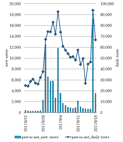 17日未明のPawooへのWeiboユーザー大量流入は、18日には一段落したようです。トゥート数/ユーザー数も少し下がりました。ただし、8月末~9月頭のTwitterからの流入時には、1週間に渡って流入があり、また、ピークも2度ほどありましたので、今後も継続的に観察していく必要がありそうです。