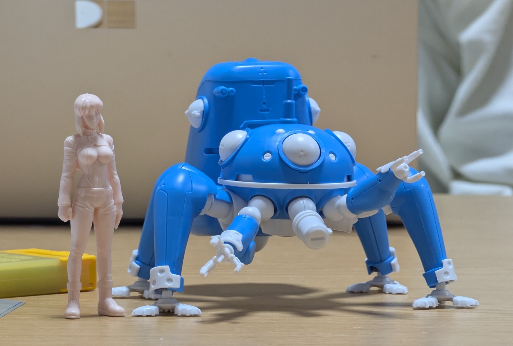 タチコマ組めた~(ウェーブ 1:24) ちゃんと色を塗るつもりだったけど成形色でもコミカルでいいな 気が向いたときに塗ろう